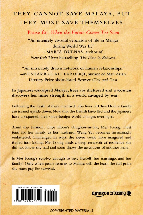 When the Future Comes Too Soon is set during the Japanese occupation of British Malaya and continues where my debut novel, The Woman Who Breathed Two Worlds, left off. Like the first book, this sequel is fictional. No character is real. But since the characters reflect ordinary Malayans, they go through experiences that many in the country would have gone through. This was my intent: to show what happened through the eyes of an Asian family.