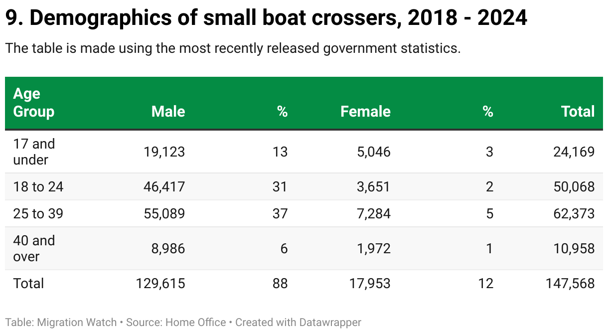 88% of arrivals on rubber dinghies are male (see data below, taken from Migration Watch UK, Source: the Home Office). And yet, in most parts of the world, it’s women who are more likely to face persecution simply because we have XX chromosomes; historically, groups genuinely fleeing danger have been evenly split by gender. No matter how you view the world, the extreme gender skew of small boat arrivals should be a red flag.