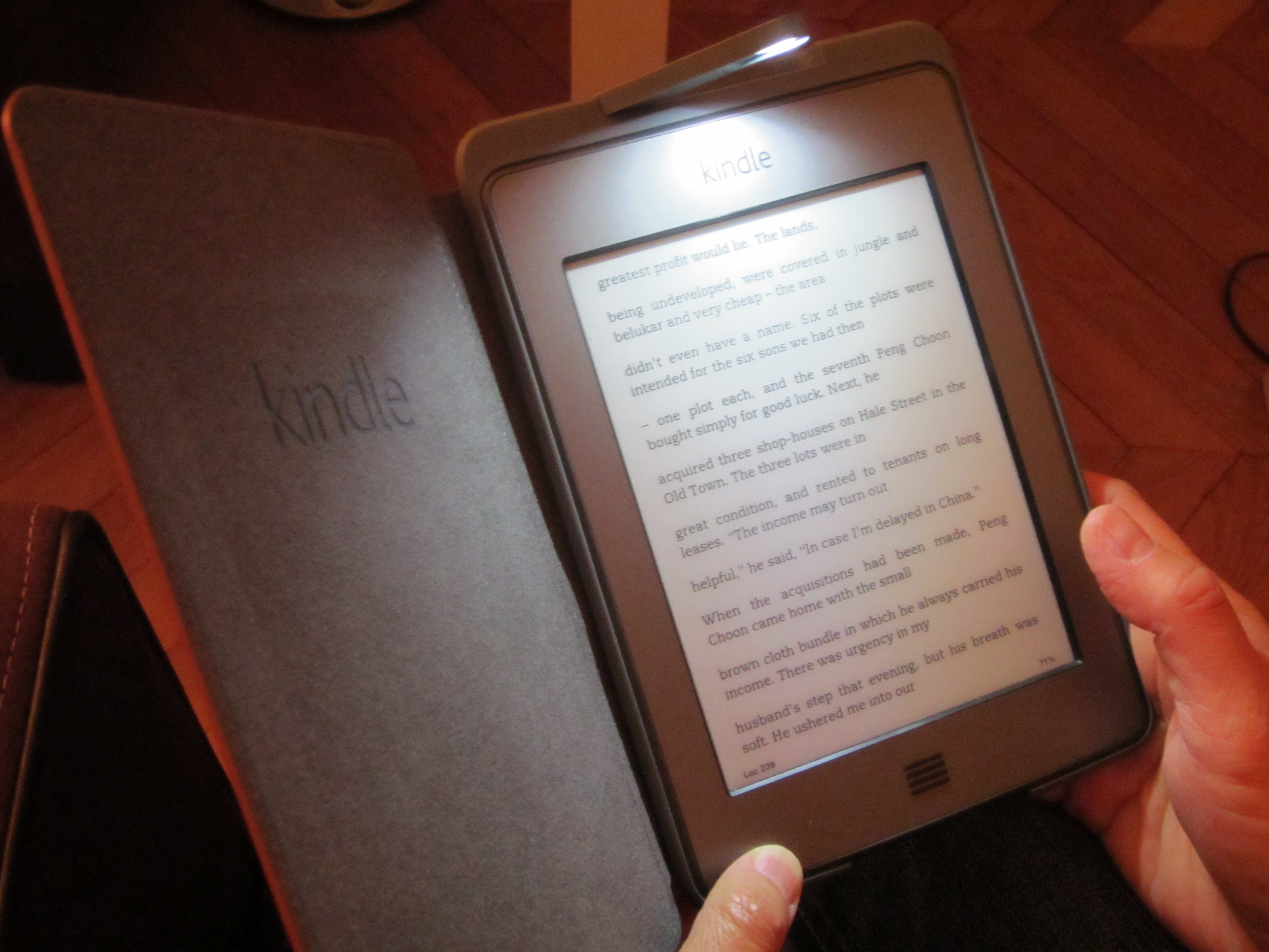 I read from a Kindle reader with a special leather cover that has its own discreet lamp at the top. The light flicks in and out; it can be fully tucked in unless needed, a highly ergonomic design. Much as I love holding a physical book, I also love my Kindle and its cover. Its leather feels wonderful in my hands, and the fact that its light shines directly onto the page is a huge bonus. The Kindle proved incredibly useful during my reading.