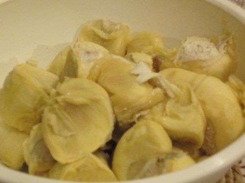 Each fruit contains six to twelve or more seeds, and each seed is covered by soft flesh. It’s this gooey flesh that is coveted by durian connoisseurs. The flesh is yellow to off-white in colour and turns to pulp in your fingers. ‘Durian’ could refer either to the whole fruit or to each of the individual flesh-covered seeds inside. If you know your durians, you can tell by looking at the colour and texture of the flesh whether it’s your favourite type or not. I like durians with dry, bright yellow flesh (see picture below) because they tend to be the sweetest. Others prefer the slightly wet, somewhat bitter variety of durians.